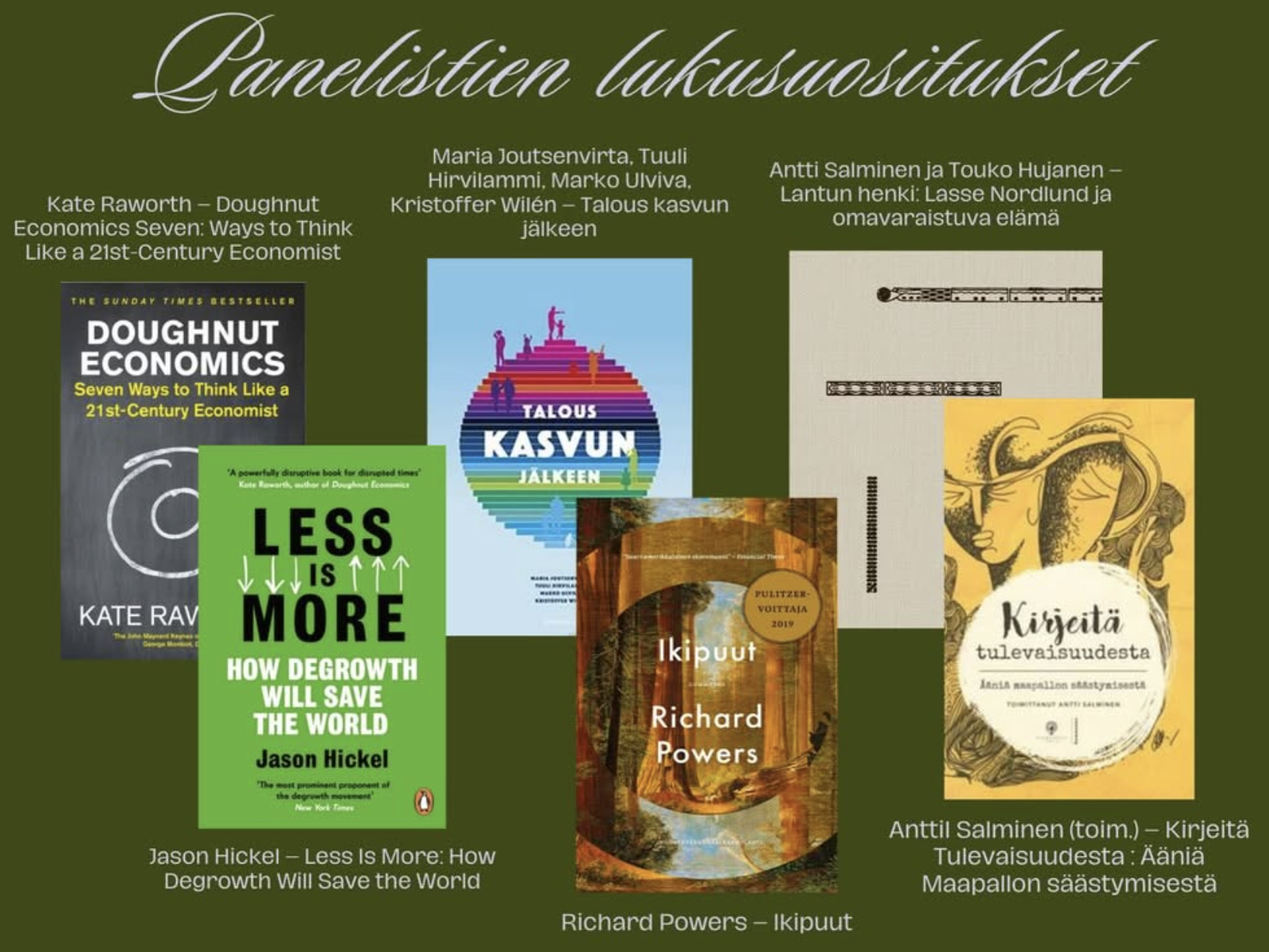 Lupausten mukaisesti listasimme panelistiemme lukuvinkit, joiden avulla kohtuutalouden ideaan voi syventyä. Oivalluksia herättävää lukuiloa toivottavat Nuorten Agenda 2030 sekä Nuorten luonto- ja ilmastoryhmä NUOLI!